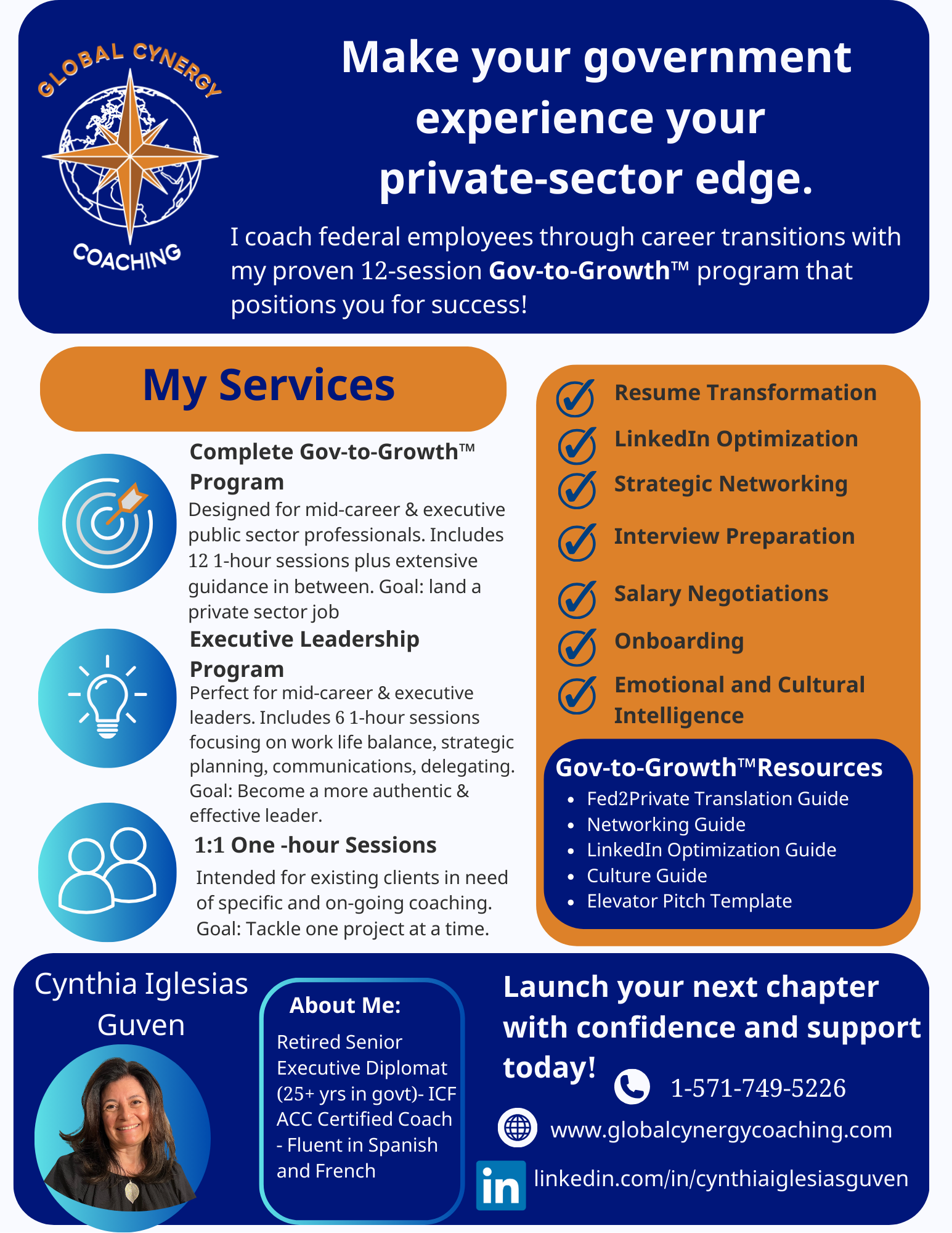 Global Cynergy Coaching Services Quick View I help federal government mid-career and executives transition to the private sector. I also help executives become authentic and effective leaders. Apply Today
